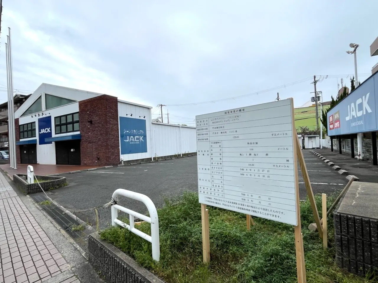 【門真市】柳田町の「ジーンズカジュアル JACK」跡地に、セブン‐イレブン「門真柳田町店」と記載された工事看板が設置されていました。
