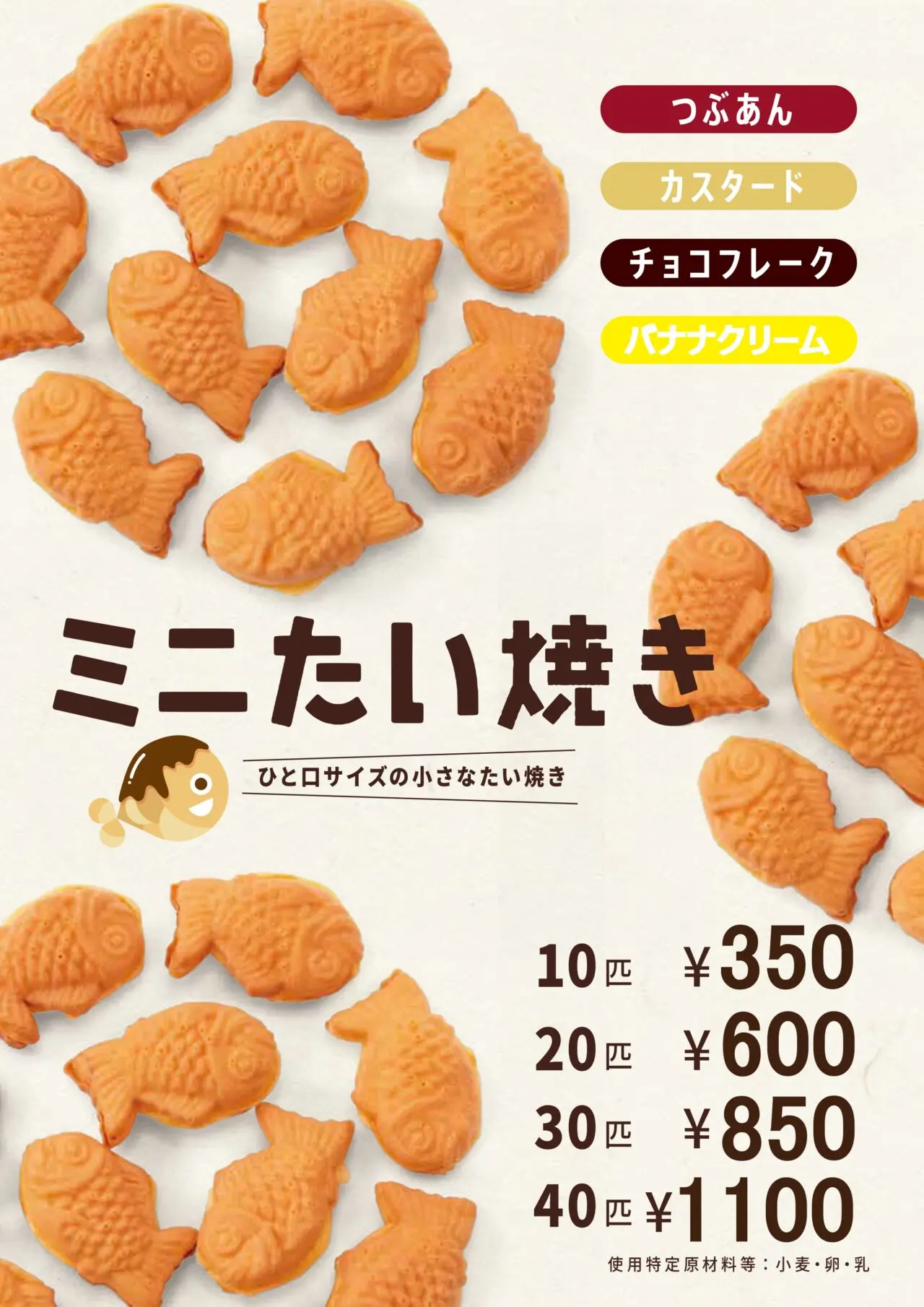 一口サイズの食べやすい鯛焼きで、つぶあん・カスタードなどの定番フレーバーのほか、期間限定フレーバーなども組み合わせて楽しめるとのことです。