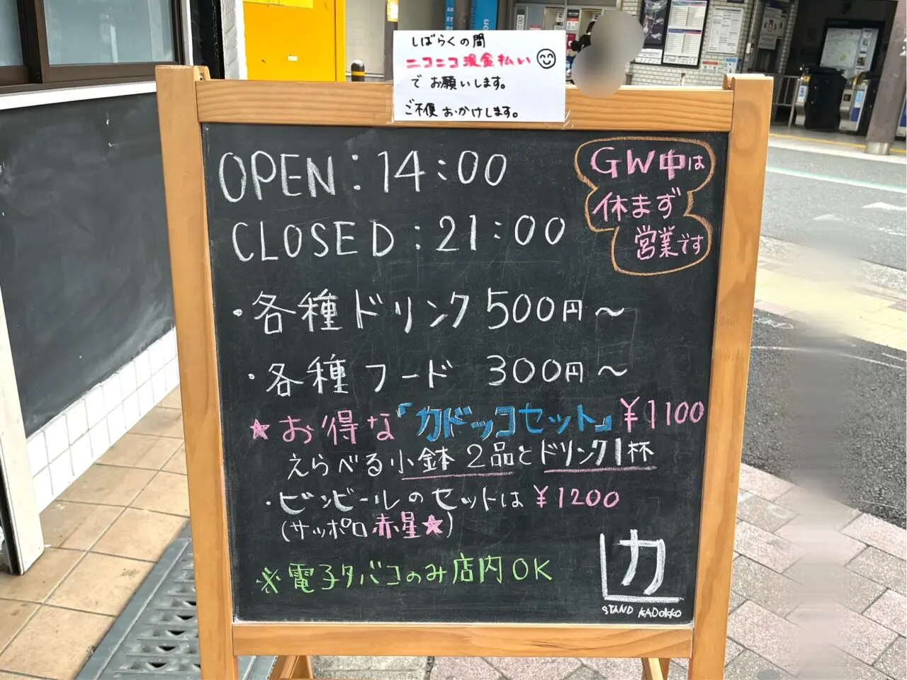 店頭の看板には、営業時間が14時から21時までと案内されていました。ドリンクは500円〜、フードは300円〜で、お得なセットも用意されているようです。